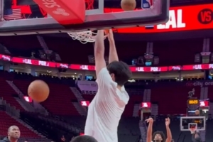 就得硬一点!杨瀚森赛前和助教对抗热身 篮下终结连续暴扣+勾手