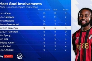 本赛季欧洲联赛参与进球榜:凯恩、姆巴佩并列第一,哈兰德第三