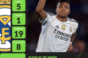 姆巴佩在9月的4场西甲打进5球,助攻1次。期间完成19次成功过人,8次射正目标。Whoscored评分达到了8.53分。