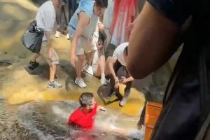 按道理情况下,那边只能进两到三个人,三到四个人一组。那边比较小,站的位置不多。所以当时我们一下都进去了,都进去以后我先拍照,那我拍完照我肯定给朋友拍一拍吧,所以我蹲那给朋友拍照的时候,不知道被谁一脚踹水里了,其实那已经很滑了。”