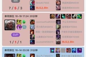 体育资讯10月19日讯 BLG上单Bin自14号凌晨后在今天再度开启韩服Rank,使用一把挖掘机(7-5-3),一把狼母(1-1-1),两把全负。