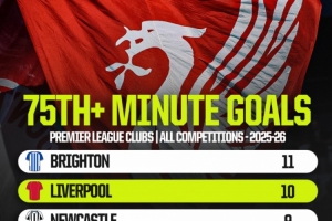 英超球队75分钟后进球榜:布莱顿11球、利物浦10球、阿森纳9球