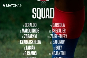 巴黎客战里昂大名单:K77领衔,阿什拉夫、登贝莱、门德斯缺席