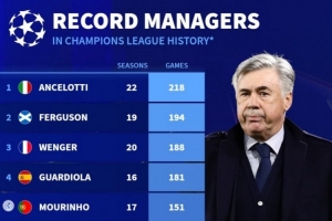 1、安切洛蒂:218场,22个赛季