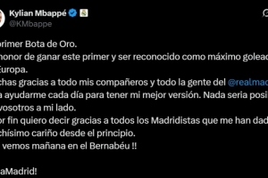 荣获欧洲金靴!姆巴佩社媒:感谢队友、皇马的每一个人和皇马球迷